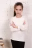 Блузка для девочек младшего школьного возраста, из однотонного трикотажного полотна - однотонная кулирка с лайкрой и шифона. Блузка полуприлегающего силуэта, с рукавом из шифона, без застежки. Спереди жабо со складками из шифона с декоративным элементом по центру. На спинке отсутствуют линии членения. Рукав длинный одношовный, присборенный по окату и низу, на манжете. Низ изделия подогнут. Срез горловины окантован.