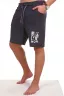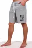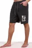 Мужские шорты из футера с лайкрой. Принт в виде надписи, пояс на резинке со шнурком, длина чуть выше коленей. Края изделия не обработаны.