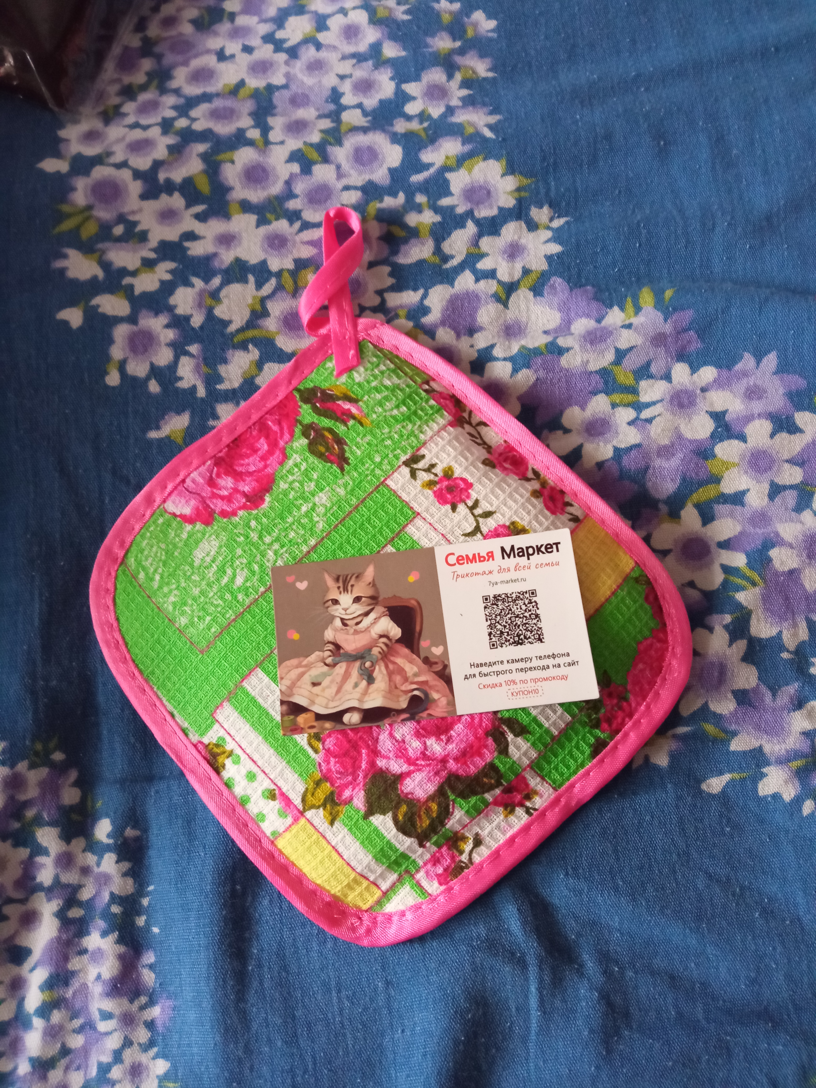 Добрый день. Очень приятно получить товар, который с любовью оформлен. Заказ пришёл во время. Товар очень качественный, ощущение родного творчества, цвет яркий, выполнен со вкусом. Всё подошло, для женщин это радость, потому что мы такие. Спасибо за подарок прихватка для кухни. Очень приятно.