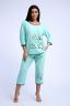 Симпатичный махровый костюм из футболки и бриджей. Футболка с рукавом-реглан длиной 3/4, на полочке изображение совы на фоне луны и звезд. Бриджи свободные, на резинке, с боковыми кармашками, на одной половинке - изображение маленькой совы.