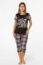 Уютный женский костюм с бриджами и футболкой из полуприлегающего кроя. Дизайн позволяет использовать данную модель как пижаму для сна, так и в качестве костюма для дома. Модель выполнена из высококачественного интерлока.