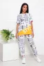 Костюм женский с брюками, материал в стилистике "Газетка". Футболка с короткими рукавами, полочка оригинального кроя с крупным принтом - надписью. Брюки на комфортном поясе, с боковыми карманами. Комфорт 100% хлопка.
