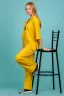 Костюм состоит из толстовки и брюк. Толстовка прямая, свободная, с капюшоном, с коротким рукавом. На полочке расположены симметричные фигурные кокетки. В нижней части боковых швов обработаны разрезы. Низ полочки и спинки завершены поясом. Брюки свободные, прямые, со стрелками, с карманами, на поясе.