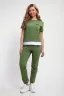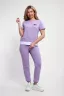 Костюм женский трикотажный - футболка и брюки. Футболка укороченная с отделкой по низу контрастного цвета. Брюки с завязками и втачными боковыми карманами. На футболке и брюки небольшие отделочные печати.