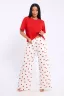 Домашняя женская пижама их мягкого хлопка. Свободная футболка прямого кроя, со смещенными плечевыми швами. Вырез горловины округлой формы с обтачкой. Длина футболки укорочена выше линии бедер, что является трендом сезона. Широкие брюки прямого кроя с высокой посадкой, с вместительными боковыми карманами, пояс на резинке с декоративной отстрочкой и атласным милым бантиком. Длина брюк стандартна, чуть ниже щиколотки.