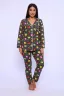Пижама свободного кроя из мягкой хлопчатобумажной ткани. Комплект состоит из кофты и брюк. Кофта с длинным рукавом, на пуговках и с карманом на груди. Атласный кант по подборту, воротнику, карману и манжету. Брюки прямые с карманами. Эта пижама отлично подойдет как домашний костюм, так и для сна. А расцветка сочные яблоки поднимет настроение.