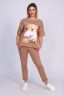 Милая пижама состоящая из футболки и брюк свободного силуэта. Футболка с отделкой кантом по горловине и рукаву, и печатью в стиле шелкографии на полочке и спинке. Зауженные брюки на резинке с карманами, имеют внизу манжет.