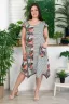 Платье женское, расширенное к низу. Полочка и спинка состоит из двух симметричных частей из тканей компаньонов: полоса и пальмы. На полочках накладные карманы. Рукав втачной, укороченный. На плече рюши, имитирующие бретель. Низ платья с углами, длина по спинке замерена от плечевой точки до верхнего угла низа.