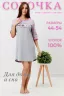 Сорочка женская, состав 100% хлопок. Силуэт сорочки прямой, слегка расширен книзу, горловина и низ рукавов обработаны окантовкой, рукав реглан, низ сорочки обработан на плоскошовной машине, на полочке принт. Идеальный вариант для дома. Изделие легкое в уходе. *Примечание: Длина рукавов реглан измеряется от горловины.