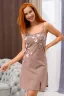 Сорочка на бретелях полуприлегающего силуэта, с фигурной линией низа, длиной выше колена. На полочке внизу обработан декоративный разрез. Проймы, бретели и разрез на полочке обработаны бейкой из основного полотна.