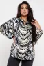 Туника женская больших размеров из легкой ткани. Изделие с округлой горловиной на завязках, рукава длинные на резинке, низ округленный и расклешенный с разрезами. Подойдет для повседневной носки.