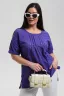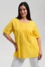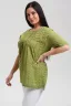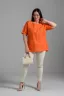 Туника прямая, свободная, с округлой горловиной, с удлиненной спинкой. Рукав короткий, с манжетом. В верхней части полочки обработаны декоративные защипы. Спинка с кокеткой. В нижней части боковых швов расположены разрезы. Горловина обработана бейкой из основного полотна.
